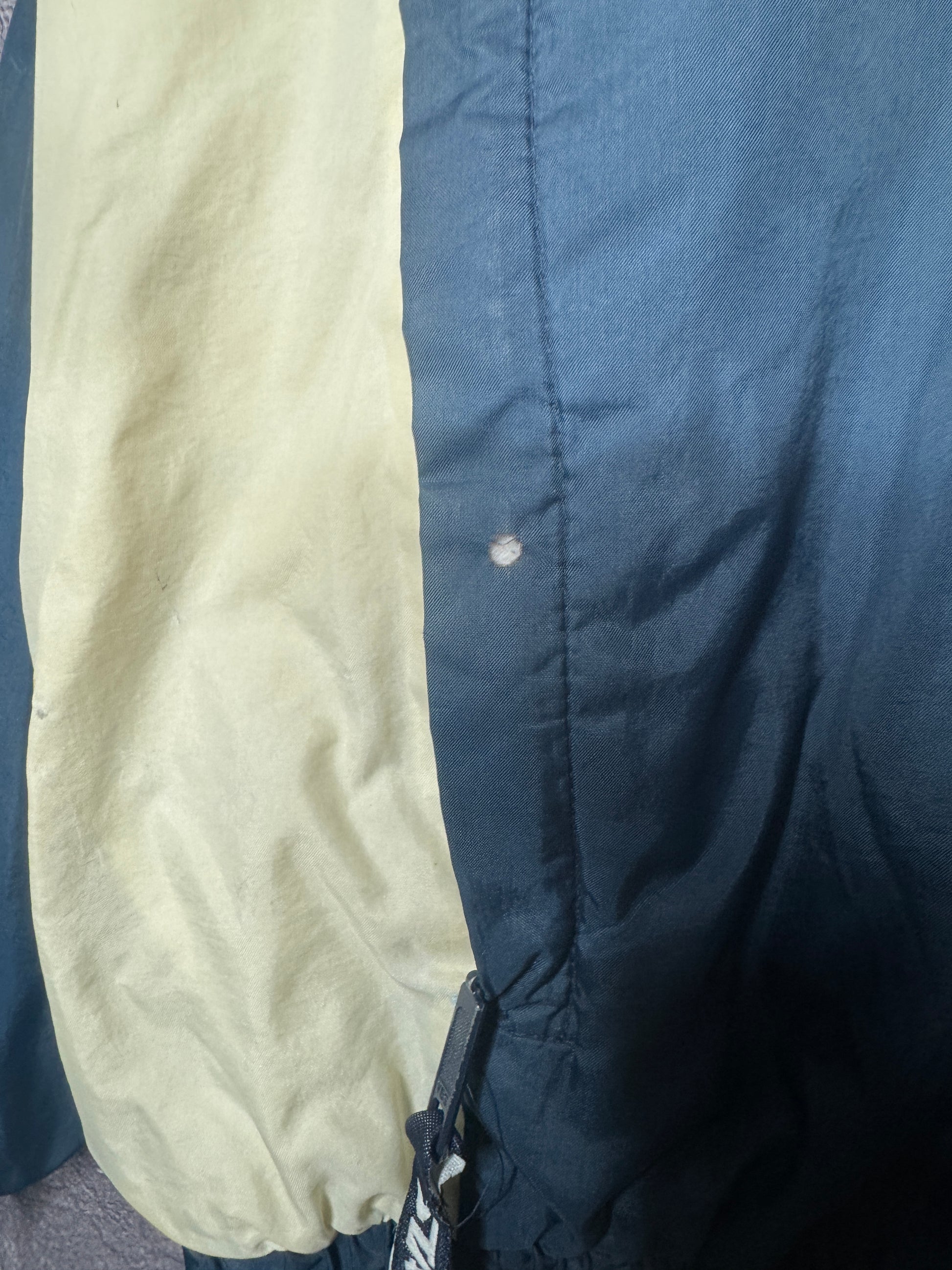 Has a attached hood in collar, has stains (white color is more tan/yellow), and a boxy fit , otherwise good vintage condition